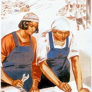 A poster dedicated to the soviet working-class women. Caption reads, "Ovladevaia tekhnikoi, bud' v pervykh riadakh stroitelei sotsializma / Овладевая техникой, будь в первых рядах строителей социализма", meaning, "Be among the first ranks of the socialism builders by mastering your technical skills". [Description English/roman)]