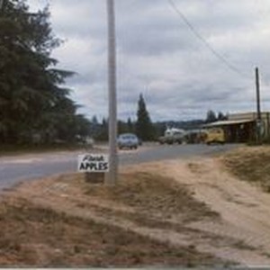 Photo--color: The Hallberg Apple Farm roadside stand sign along Gravenstein Highway North (Highway 116) 1979.