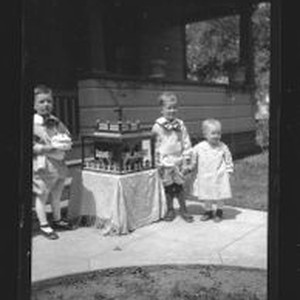 Photo--black and white: A children's birthday party with three young toddlers around a table with a fort-like toy. The boy on the left appears to be holding a birthday cake. about 1920-30.