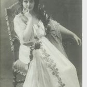 Postcard--black and white, photo: seated woman, Marie Booth Russell, in Victorian fashion. Photo titled "Marie Booth Russell" "rotograph" series. The Rotograph Co. N.Y. City" . Ms Russell was actress and wife of well known Shakespearean actor Robert B. Mantell who died in 1911.