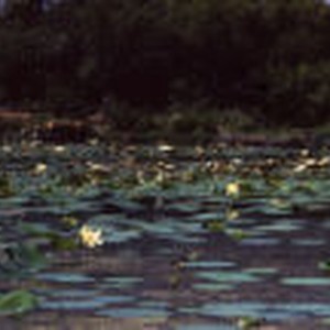 White flowers and lily pads with trees in the background.