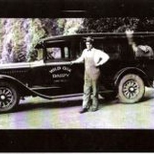 Photo--black and white: Unknown man in front of a black delivery truck with "Wild Oak Dairy Camp Meeker" painted on driver's door.