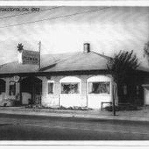 Photo--black and white: The Sebastopol Petaluma and Santa Rosa (P&SR) Railway depot station as seen in 1969. At that time it was the Clarmark Florist Shop. The depot station was built in 1917 by architect Brainard Jones of Petaluma. The florist shop has enclosed part of the covered walkway the circles the building.