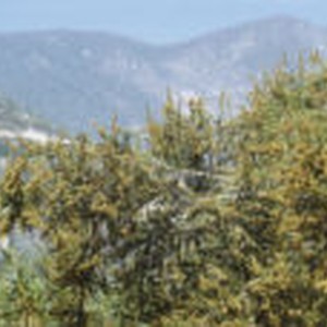 View of a recently out of bloom shrub with mountains in the background.