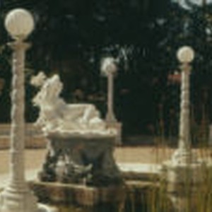 Marble statue in a lily pond with lamp posts, in a garden at Hearst Castle.