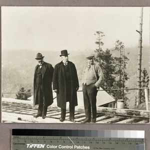 One of a series of photographs from a trip to Cascada (now Big Creek) California, on the San Joaquin & Eastern R.R., 4/7/14. Based on MS information on verso of HEH 61/3/3 (7) copy 1, the men are identified as "Mr. George C. Ward, Mr. Huntington, Mr. Rollins."