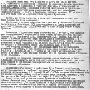 Стенограмма или проект письмо обращение от президиума ВСЕХиБ к общинам евангельских церквей по поводу объединения ВСЕХиБ с Пятидесятническими общинами (ХВЕ и ХЕВ). Письмо было направленно 1 сентября 1945 года. Подписали обращения к церквм: Яков Иванович Жидков, И.И. Голяев, М.А. Орлов, Александр Васильевич Карев, П.И. Малин. Письмо обращение от президиума ВСЕХиБ к общинам евангельских церквей по поводу объединения ВСЕХиБ с Пятидесятническими общинами (ХВЕ и ХЕВ). Письмо было направленно 1 сентября 1945 года. Подписали обращения к церквм: Жидков И.Я, Голяев И.И., Орлов М.А., Карев А.В., Малин П.И. [Description (original non-English/roman language/script)]