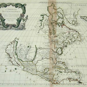 Kashnor notes, "A very scarce map, showing California as an island, locating Pto. de Francisco Draco, Monterey, and San Diego." McLaughlin identifies as State 1 of an Italian version of the 1669 revision of Sanson's original 1650 map. Map taped to frame, stained from glueing center section, needs conservation. Information on display frame is incorrect. Prime meridian: Ferro. Relief: pictorial. Projection: Pseudocylindrical. Watermark: Circled fleur-di-lis. Printing Process: Copper engraving. Other Features: Cartouche. References: McLaughlin 65; Wheat 59; Tooley 42; Leighly 53; Portinaro (Plate XCVI, State 3),. Verso Text: MS notes: America Settenrionale (three times).