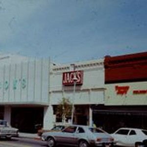 Print, color: The east side of North Main Street Sebastopol, about 1970s. Businesses seen are Tracy Joy's Children's shop is to the right, Jack's and Carlson's. Carlson's was a post office and Starland Theatre.