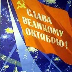 Soviet poster dedicated to the 1917 October revolution in Russia (aka Bolshevik's revolution). Text on flag reads, "Слава Великому Октябрю! / Slava Velikomu Oktiabriu!", meaning "Glory to the Great October!". [Description English/roman)]