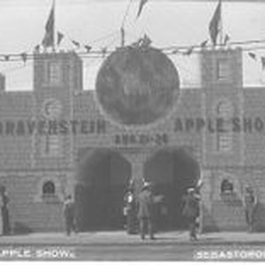 Postcard photo, black and white: The 1911 Gravenstein Apple Show main entrance with facade made to look like a stone or brick castle. The flags and exhibit tent are visible in the background. Several people are standing around the entrance with a vintage car to the right.