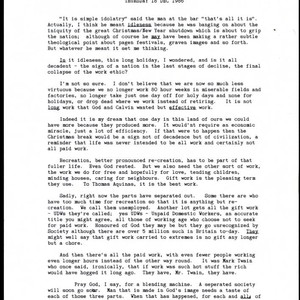 Thought for the day on idolatry and idleness in Christmas culture, and how life should be centered around effective work for one's self and loved ones, and not just long hours for personal profit, December 18, 1986; Charles Handy Papers; Box 18, Folder 2; 1 page