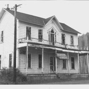Photo--black and white: Old Freestone Hotel in Freestone built in circa 1870. Photo taken in 1959. Front view of hotel is facing Bohemian Highway. White clapboard building is boarded up and not in use. Originally known as the Park House.