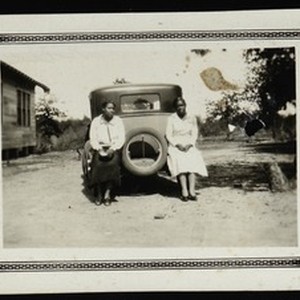 Photograph of "Page Normal, Bobbie Dunn &" -- written on back. Sitting on a car bumper, [s.d.]. [Description English/roman)]