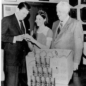 California Governor Ronald Reagan in the governor's office in Sacramento 1968 being presented with cases of apples, apple juice and apple sauce from "Sebastopol's Finest" by Sebastopol's Apple Queen with State Senator Randolph Collier looking on