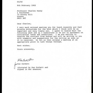 Original: Dictated correspondence from Sue Corbett to Charles Handy regarding Handy's book, February 9, 1983; Charles Handy Papers, Box 9, Folder 7; 1 page