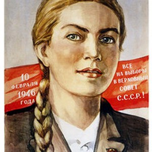 Soviet poster dedicated to the Supreme Soviet (Council) elections on February 10, 1946. Captions read, "Я буду голосовать за кандидатов блока коммунистов и беспартийных! / Ia budu golosovat' za kandidatov bloka kommunistov i bespartiinykh!", meaning, "I'll vote for the bloc of communists and nonpartisans". [Description English/roman)]