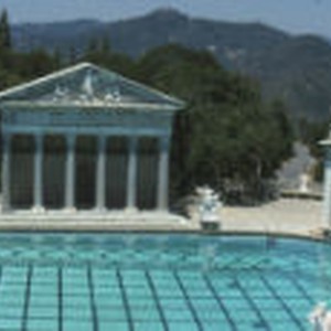 A Roman temple facade and marble statues, are part of the outdoor pool at the Hearst Castle.