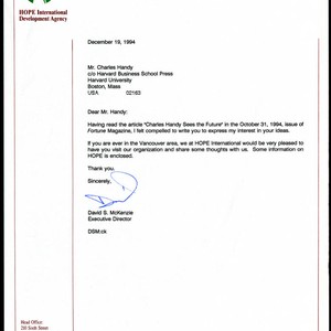 Correspondence to Charles Handy from David S. McKenzie expressing interest in Handy's ideas and requesting Handy's visit to McKenzie's organization, HOPE International. Specifically, McKenzie relates that he has read Handy's article in Fortune magazine and would like him to visit HOPE in Vancouver to share his thoughts. He closes the letter noting that he has enclosed information on HOPE.