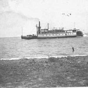 Photo--black and white: The paddle-wheel steamer "Gold." The paddle-wheel was owned by the P&SR railway and was used to haul Sonoma County fruit, eggs, milk and lumber from the end of the P&SR line in Petaluma to its docks and on to San Francisco.