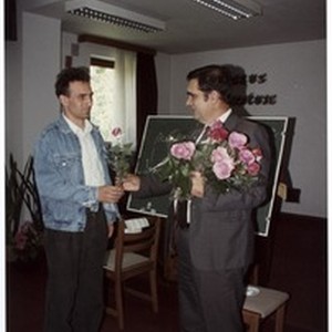 Fotografija Mihaela Kuzmiča kako studentu daje ružu nakon završetka seminara. [Description (original non-English/roman language/script)] Photograph of Mihael Kuzmič giving a rose to a student after the end of a course. [Description English/roman)]