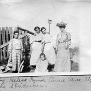 Photo--black and white: Group of girls and woman circa 1908. Miss Ashby is the woman with a hat. Other girls shown are Helen Ramos, Anne Alves, Alpha Pitkin and Bessie Sheidecker.