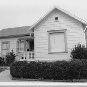 Photo, black and white: Sebastopol house at 7132 Burnett Street a Queen Anne Cottage built in the Burnett Addition. House photographed in 1993 by Evelyn McClure for her book "Sebastopol, California : History, Homes and People."