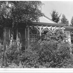 Photo, black and white: Sebastopol house at 696 North Main Street a bungalow built in 1912. House photographed in 1993 by Evelyn McClure for her book "Sebastopol, California : History, Homes and People."