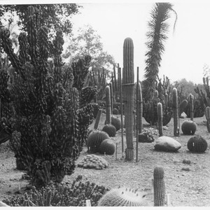 A view of the desert garden with one specimen surrounded by wooden supports. The label of this photograph (not shown here) reads "General view - 1924."