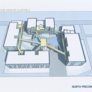 This site plan shows the pedestrian circulation patterns within this section of San Joaquin. The mixed height of the buildings, break up the massing of the structures which hold faculty apartments, lounges, and study spaces. The plan emphasizes communal spaces by placing them close to the public walkways. The buildings were sited so as not to impede upon the Storke Ranch properties immediately to the north.