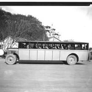 Photo--black and white: Analy Union High School bus No. 5 full of students in driveway with Analy in background, about 1920s.