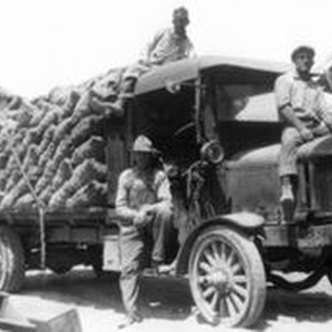 Photo--Black and white: The Garbo Orchard, sacks of apples stacked on the flat bed of a vintage truck with four men circa mid 1910s. The apples in the sacks are windfalls and were picked off the ground. After filling a burlap sack, each man had to sew up the sack with twine to secure the apples. The Garbro Orchard was located at Vine Hill Road and River Road area. The Garbro Orchard was operated by brothers A.M. and J.M. Garcia.