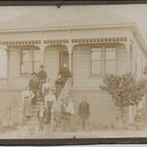 Photo -sepia, studio matted: The Borba family, adults and children, standing on the steps and front yard of a large house about 1880-1890s.