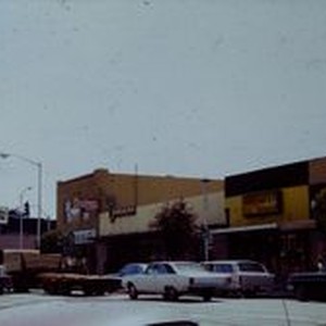 Print, color: West side of North Main Street Sebastopol circa 1970s. Businesses seen L-R: Don's Restaurant, Imperial Savings, Pease Pharmacy (was previously a grocery store), Jordan's Stationery (was previously a grocery store) and Whaley's Fabrics.