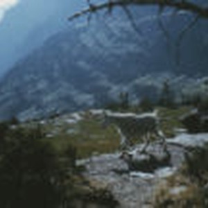 A male goat on a rocky ridge among green vegetation on the Hidden Lake Trail.