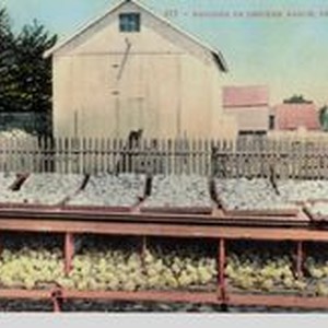 Photo--color--Enlarged photocopy of a postcard. Caption: "877--Brooder on Chicken ranch in Petaluma, California." A large table of crates of hatched eggs and the baby chicks below. Barns in background. Anna Cherney's chichen egg ranch.