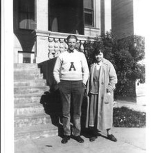 Photo -black and white: Bunni Myer and friend in 1924. The young man is wearing an Analy High School sweater and both are standing in front of a house. Bunni is 18 or 19 years old.