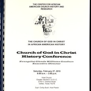 Program for the Church of God in Christ history conference, "The Church of God and Christ in African American history", Dallas, Texas, 2010 February 27. [Description English/roman)]