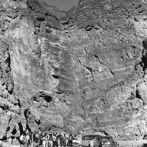 Negative shows a group of students and teachers at Titus Canyon. Two automobiles and a van are at the right of the photograph. Scanned with Epson Perfection V700 Photo as 1200 dpi TIFF image in 8 bit grayscale.