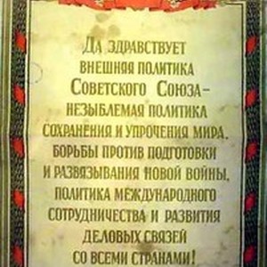Soviet political poster dedicated to what was claimed to be the peaceful international politics conducted by the Soviet Union. Text reads, "Да здравствует внешняя политика Советского Союза -- незыблемая политика сохранения и упрочения мира, борьбы против подготовки и развязывания новой войны, политика международного сотрудничества и развития деловых связей со всеми странами!". [Description English/roman)]