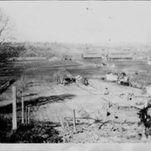 Photo--black and white: West County, possibly Graton, CA. circa 1930. Barns and house seen with fields in between. Fence in foreground.