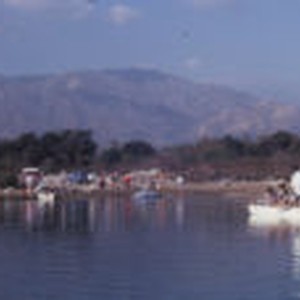People with rafts on the the lake. Mountains in the background.