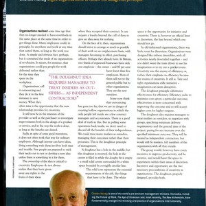 Article by Charles Handy on how organizations can foster creativity by following the doughnut principle. Handy begins the article describing how organizations are currently and regularly outsourcing work to employees in the modern era, describing this phenomenon as a missed opportunity to stimulate creativity for employers. He proceeds to recommend that organizations continue to engage in outsourcing as much as possible on the basis of treating insiders as outsiders, managing their outcomes rather than their actual processes. Handy identifies this work order as the doughnut principle of management, which, he notes, substitutes effectiveness for efficiency and, properly implemented, provides both incentive and opportunity to workers.