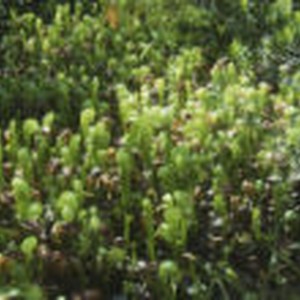 Large cluster of bright green and dried wilted California pitcherplants.