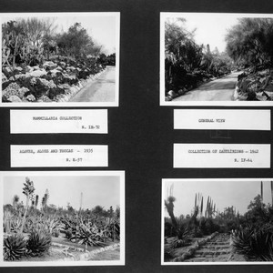 Four photographs of the desert garden mounted on a black page, labeled "Mammillaria collection, N. IH-72", "General view", "Agaves, Aloes and Yuccas - 1935, N. K-57", and "Collection of Dasylirions - 1942, N. IF-64."