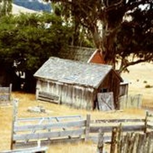 Slide, color transparency: Unidentified old barn, fence and Eucalyptus tree. 1982