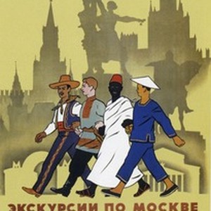 A poster advertising tours in Moscow. Caption reads, "Ekskursii po Moskve / Экскурсии по Москве", meaning "Tours in [sightseeing of] Moscow". Contains the same text in for languages: English, French, German and Spanish. [Description English/roman)]