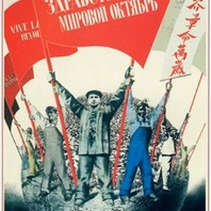 A poster showing several working-class men of different races and nationalities holding banners with inscription "Da zdravstvuet mirovoi Oktiabr'/Да здравствует мировой Oктябрь" on them written in different languages. The phrase can be translated as "Long live the world October" where "October" refers to the 1917 Bolsheviks Revolution in Russia. [Description English/roman)]
