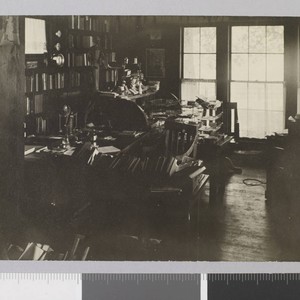Interior view of Jack London's study and desk in cottage at Jack London Ranch. Title and date transcribed from envelope. Verso of photograph reads: "Jack London's Desk."
