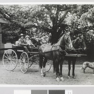 Jack and Charmian London sit in horse-drawn carriage outside of the cottage on Jack London Ranch. Two horses are harnessed to the carriage, a dog stands next to horses. Title and date transcribed from envelope. Copy print of original.